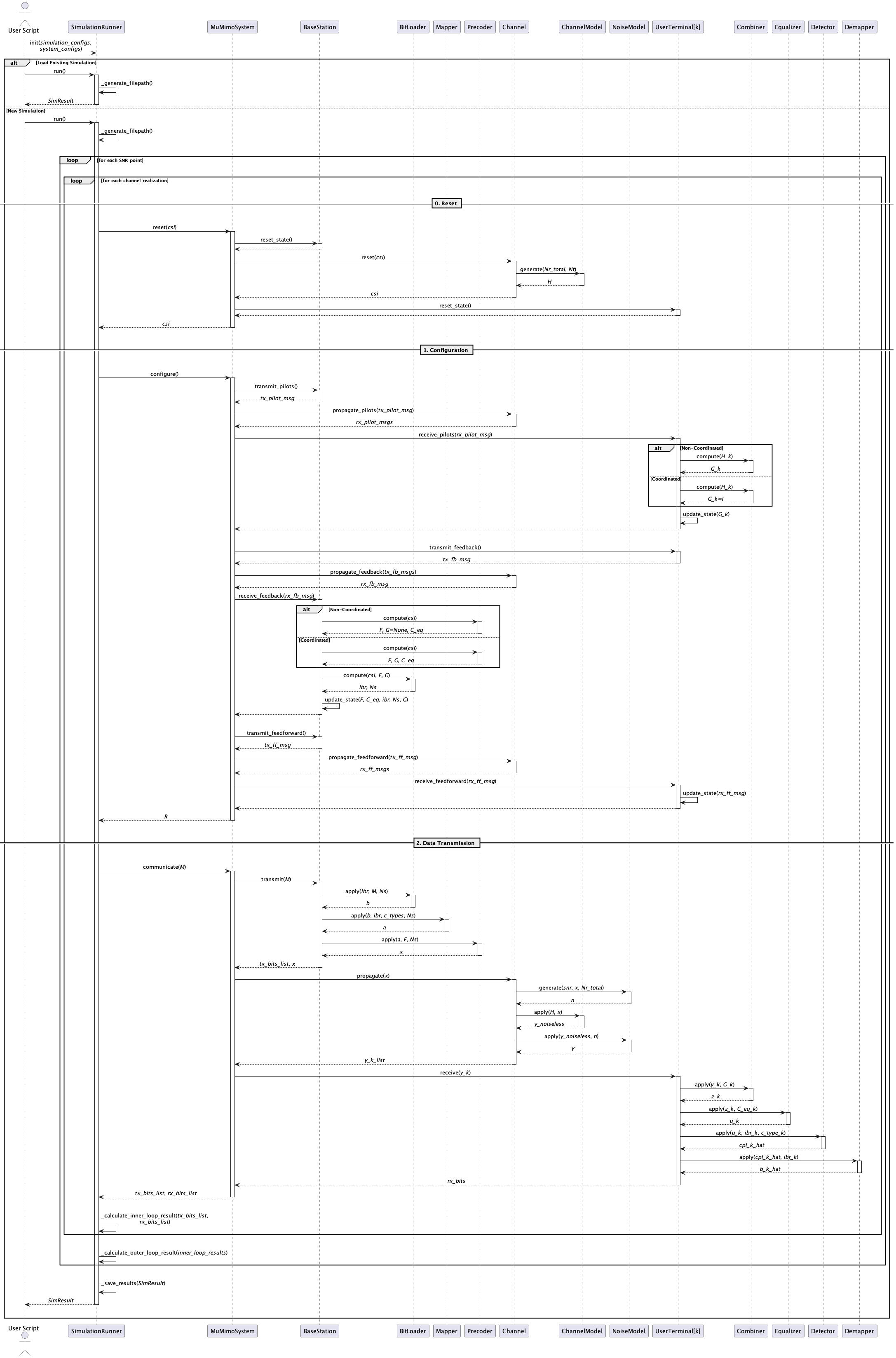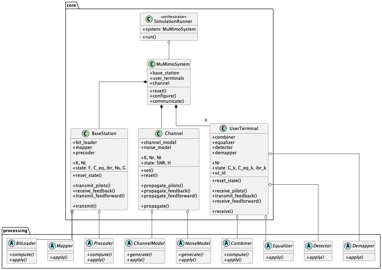 The simulation is built around a modular class hierarchy that separates the core system components from the interchangeable processing algorithms. The simulation runner orchestrates the simulation loop, driving a MU-MIMO system that encapsulates a base station (BS), a set of user terminal (UT) instances, and a channel. Each core component delegates its signal processing to abstract processing classes, which can be swapped out independently to test different algorithms, as shown in the class diagram below.